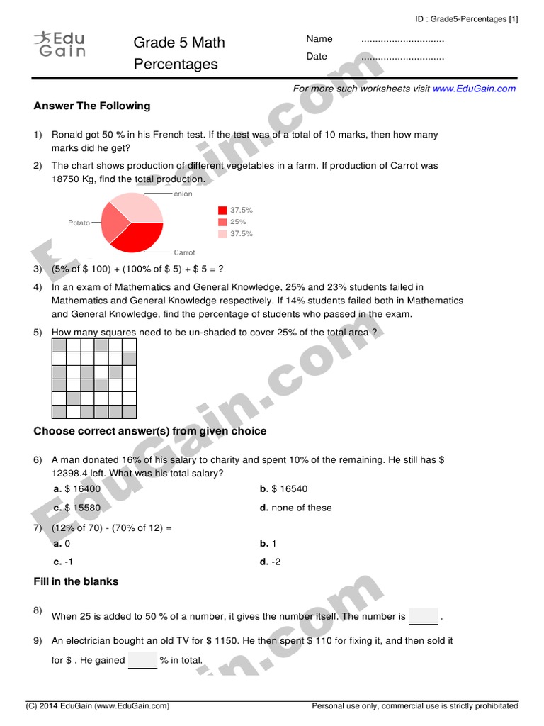 Math worksheets for grade 5 percentage